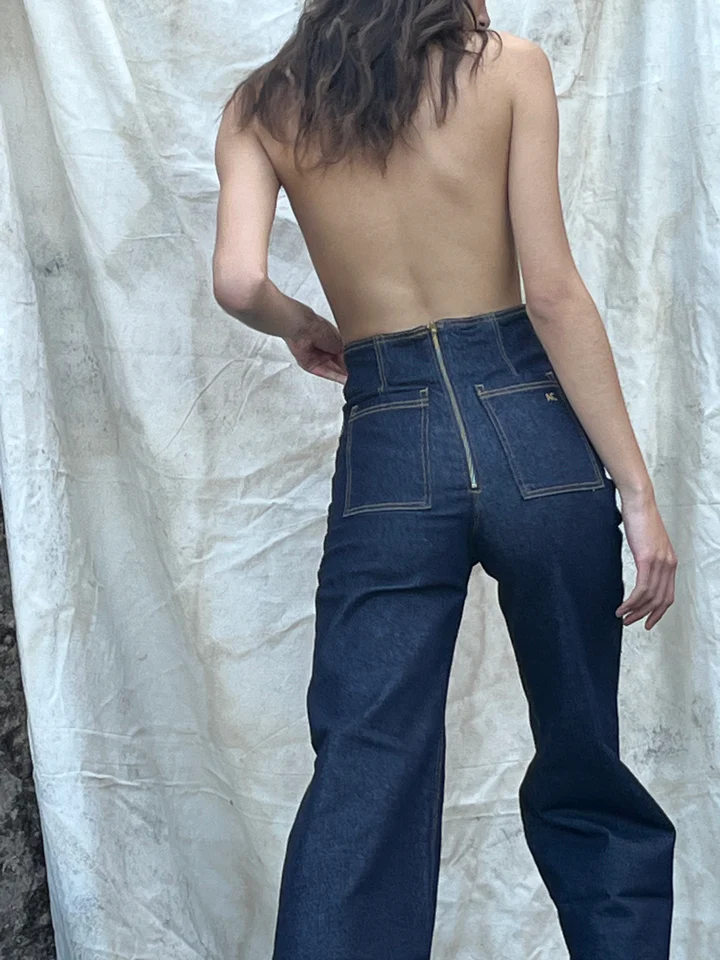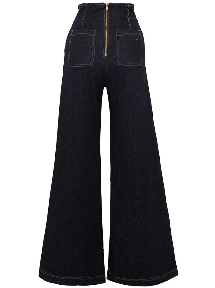 Crafted from premium European denim with a hint of stretch, these super high-rise jeans feature a wide length fit through the leg. Front and back patch pockets, an exposed gold metal zip, and contrast stitching and logo complete the artistic design.