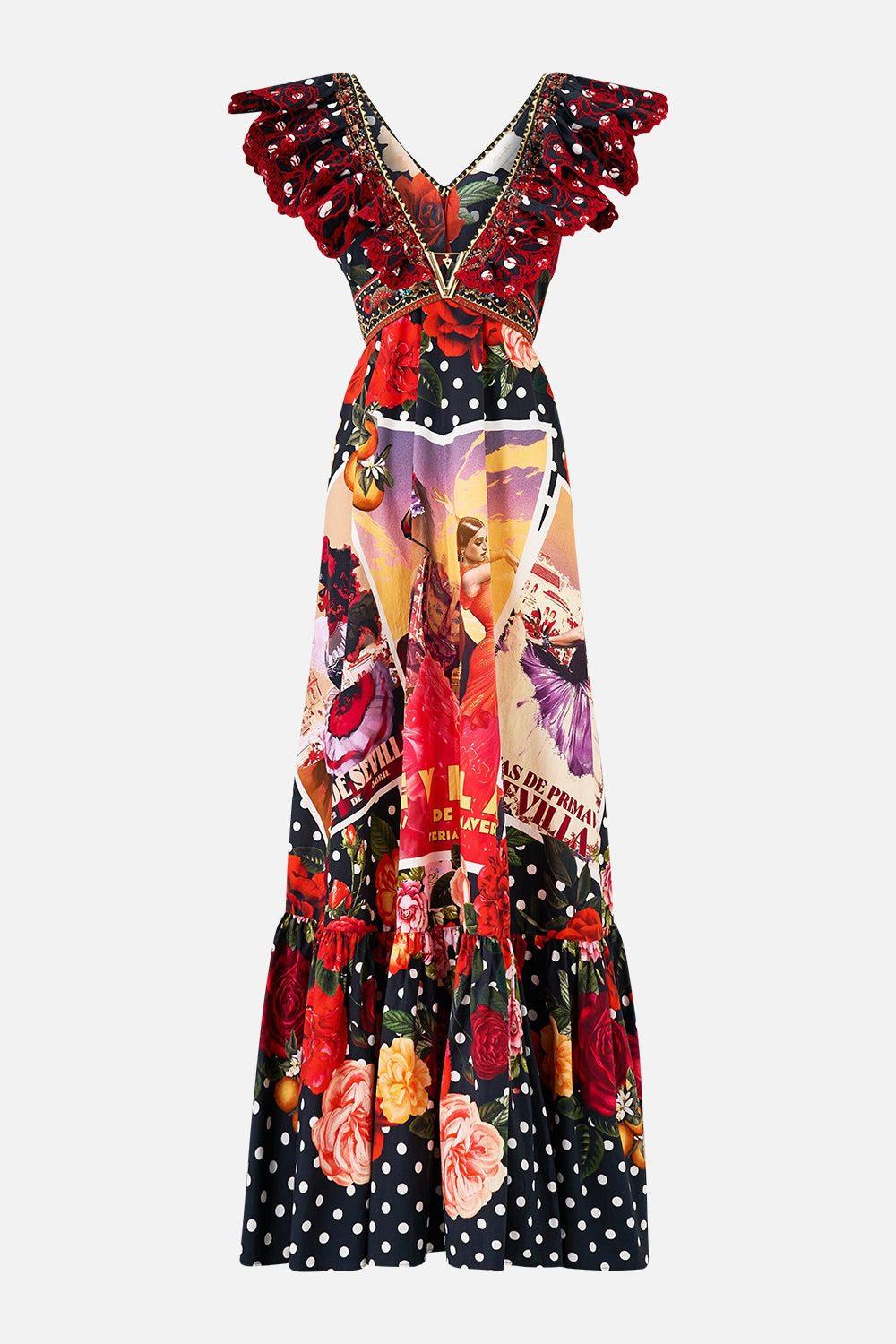The Daughters Of Duende Frill Neck Dress With Hardware is a handcrafted silhouette designed by our in house artisans. Reimagined in an exclusive limited edition print, this cotton v-neck dress is cut in a fit and flare shape and falls to a sweeping, full length hemline. It’s decorated with intricate hand embroidery at the sleeves, our signature CAMILLA charms on tasselled ends and dramatic back ties for your most tailored fit. Thoughtfully cut to be the sensation of your next occasion.