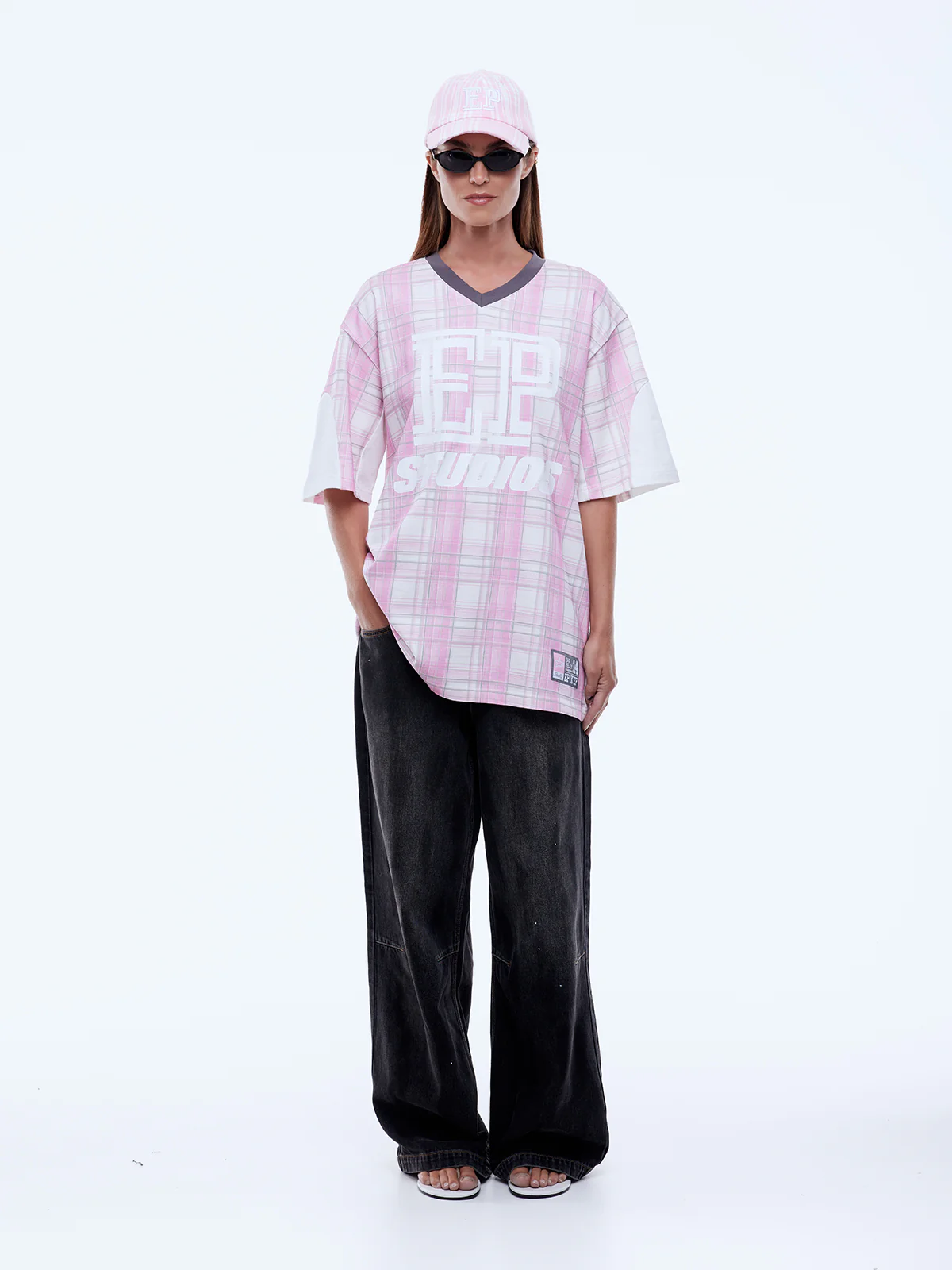 The Lunar Jersey is cut from cotton with contrast rib detailing and an oversized silhouette that drapes effortlessly in pink check. Highlighted by its all-over yardage print and monochromatic curved sleeve panels for a confident, street-ready finish.