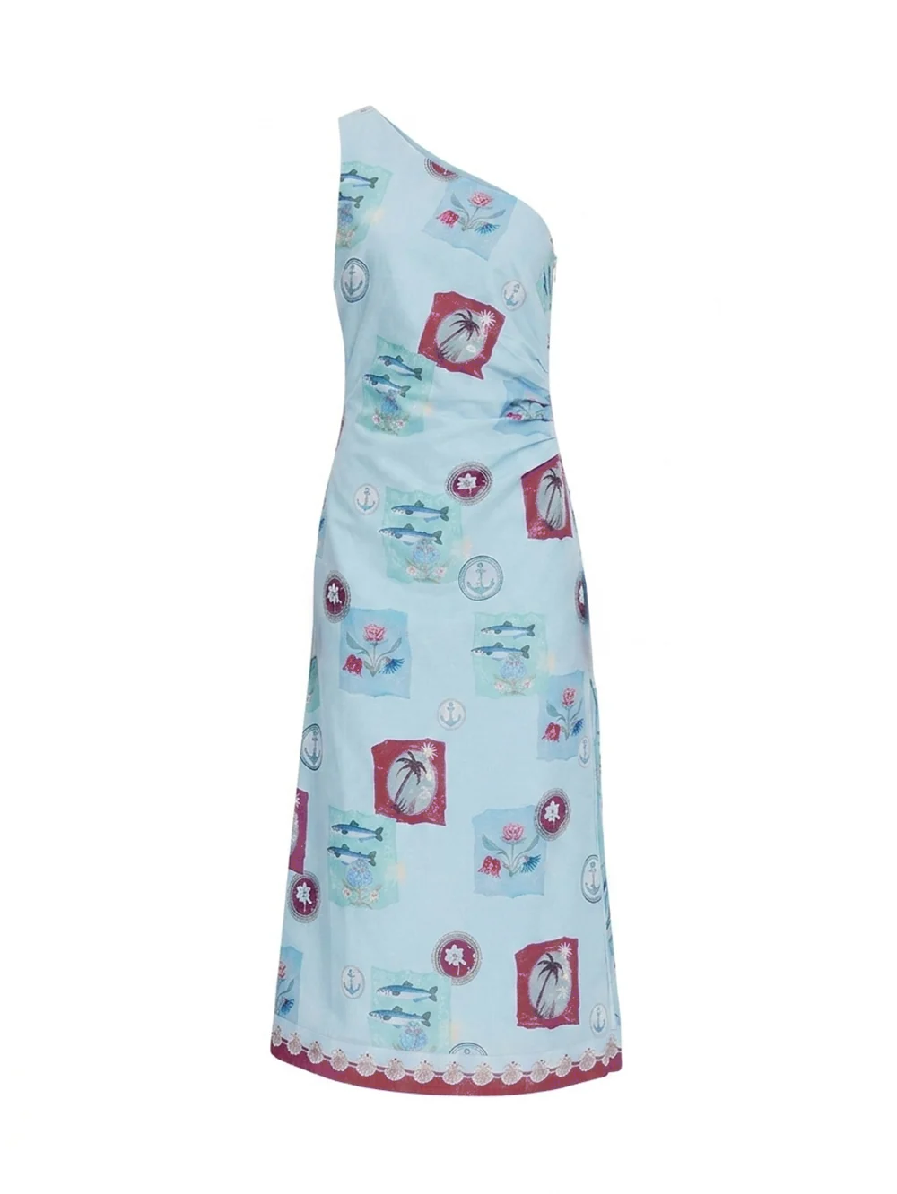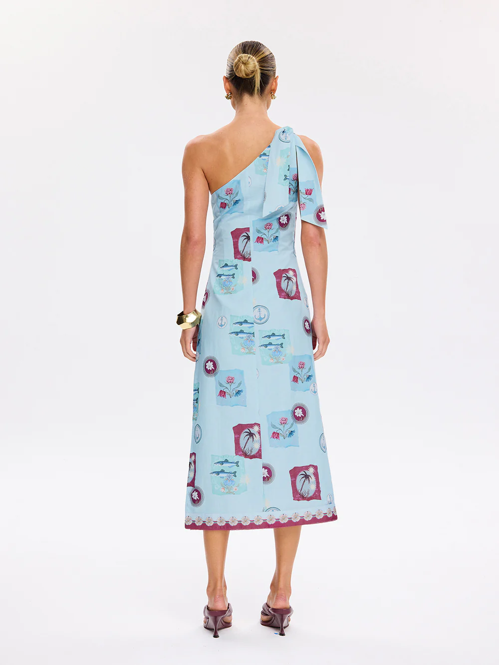 Sintra is a playful coastal collage of illustrated fish and tropical motifs, set against a soft blue base. The Sintra Midi Dress silhouette features an asymmetric neckline and adjustable shoulder tie, finished with contrast detailing along the neckline and hem. Perfect for long lunches, coastal getaways and elevated evening occasions.