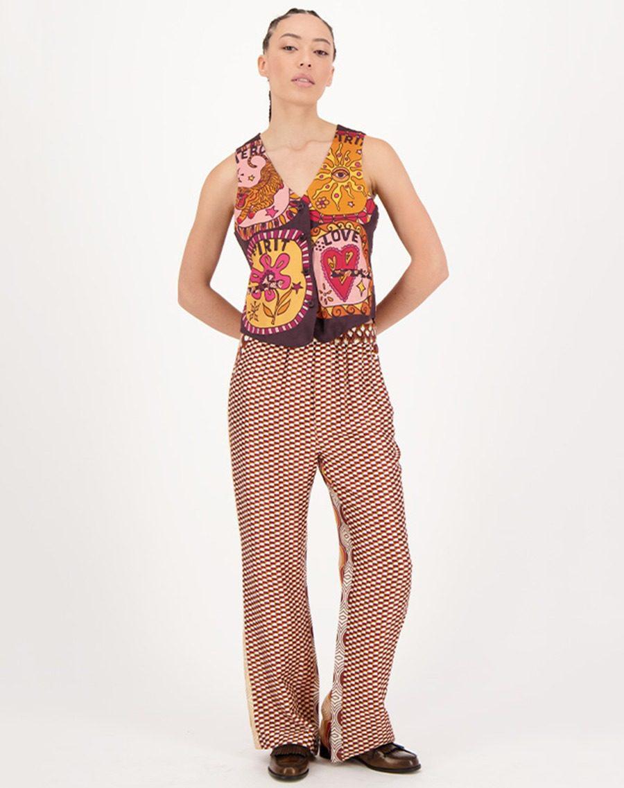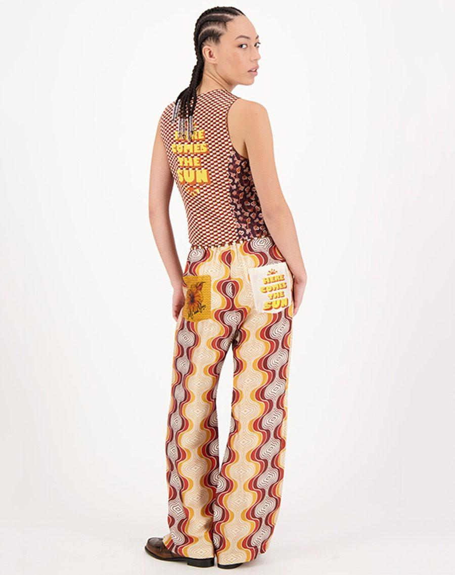 Elastic waist straight track pants in our Sunset print. Two side pockets, two back pockets. Pants are in a geometric print in browns, tans and oranges. Back of the pants features a wavy, vertical print. Back pockets have a flower on one; the other reads “HERE COMES THE SUN”. Pair with our matching Isabel or Grace shirt for a joyful complete look.