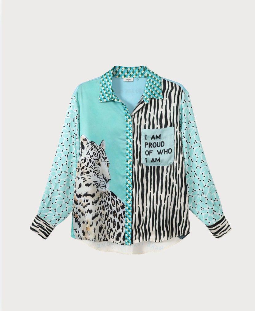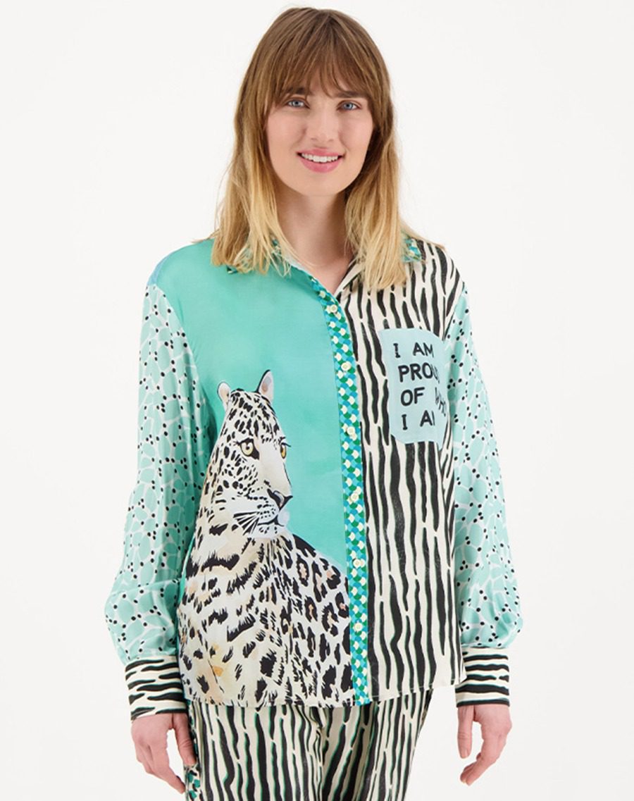 Long sleeve button down shirt with collar and cuffs in our Tropical Safari print which is in turquoise, black and white. Large leopard graphic on one side of the front and thin black wavy stripes on the other. Pocket reads,âI AM PROUD OF WHO I AMâ. Cuffs match the stripes. Sleeves and collar are small geometrics. Back reads âYOU ARE THE UNIVERSEâ along the top and âAMAZING THINGS WILL HAPPENâ with beautiful palm trees in the center Pair with our matching Bailey track pants for a complete artistic look.