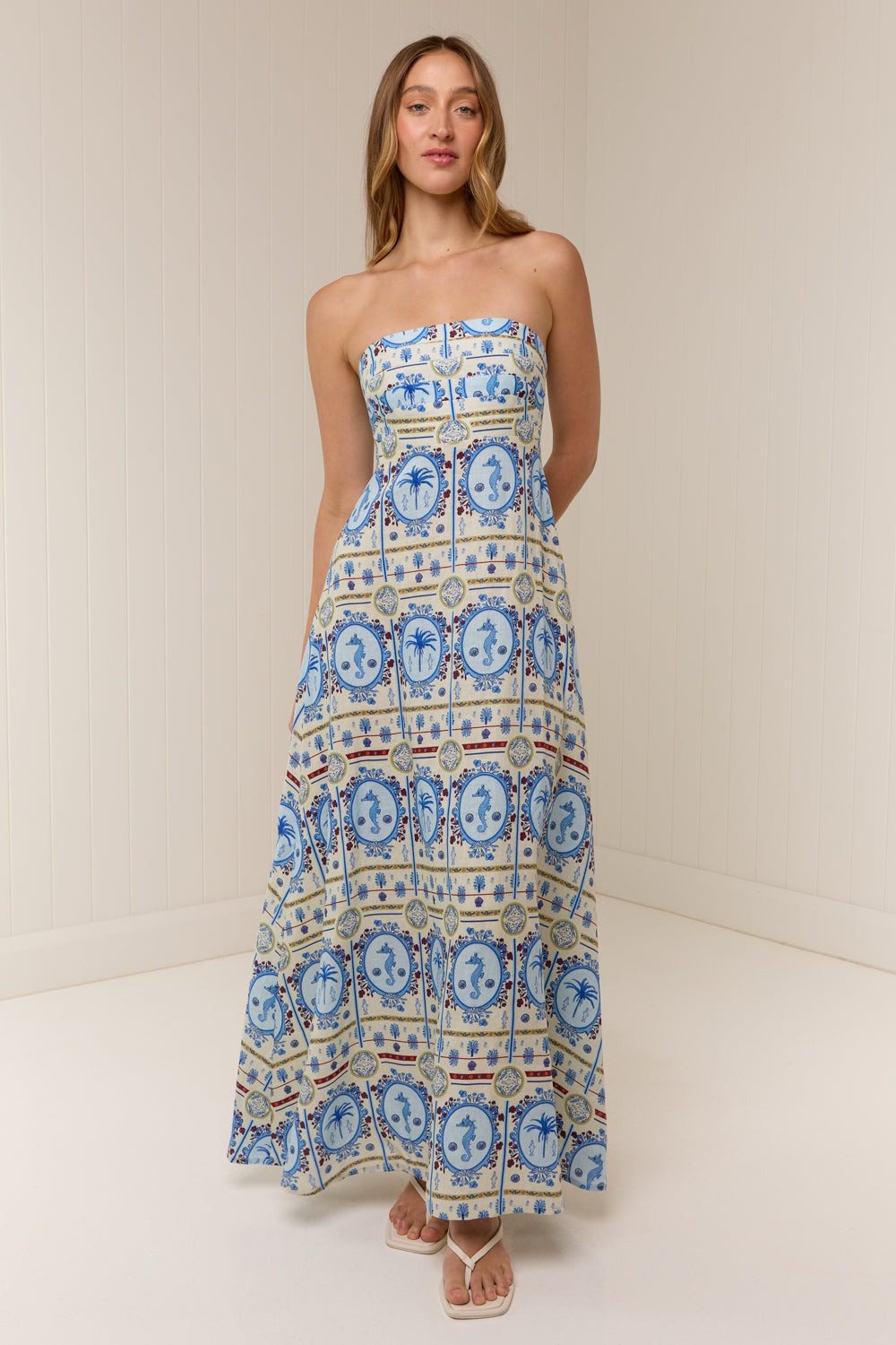 The Primrose Dress in Lagoona Tile is a strapless maxi dress, crafted from a premium Linen. Featuring a shirred elasticated back panel, fitted bodice and A-line skirt for a feminine finish. This dress is sold with detachable adjustable straps. Please refer to our size and fit guide for further fit details.