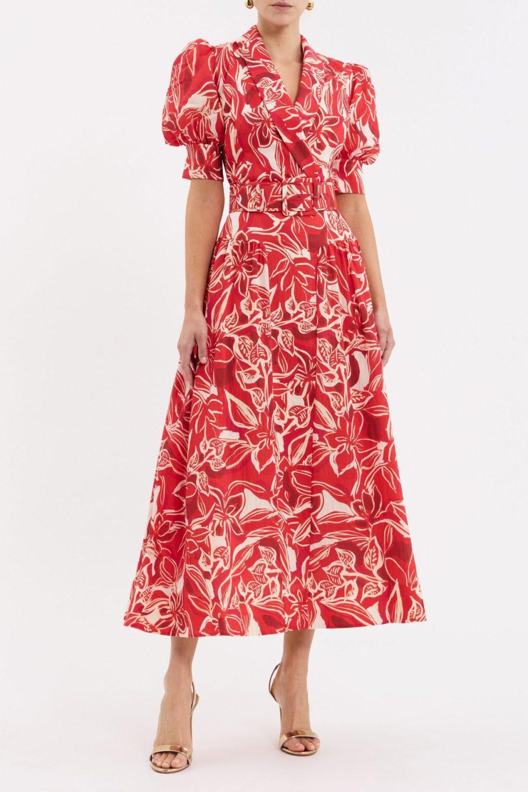 The Alloure Midi Dress embodies modern elegance with a playful floral print. Short puff sleeves with wide cuffs and a sleek stand collar seamlessly blend with a sharp peak lapel. The drop waist and circular midi skirt create a flattering silhouette, accentuated by princess seams and a self-belt. Complete with an invisible zip fastening at the side, this dress is a versatile addition to your wardrobe.