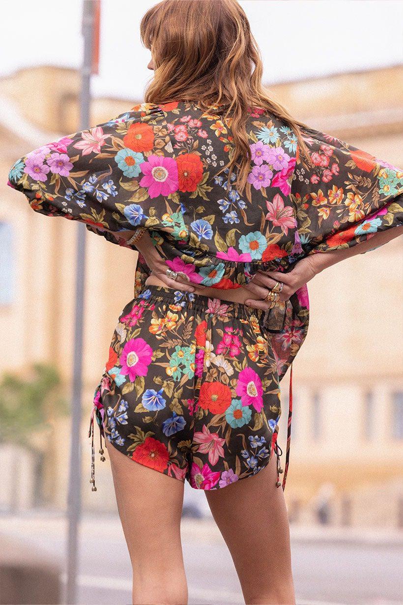 Elevate your wardrobe with the Valley of the Dolls Short in sleek Onyx. Crafted from sustainable LENZING™ ECOVERO™ Viscose, this piece features a comfortable elastic waist, functional side pockets, and distinctive side seam ruching with ties for added dimension. Finished with custom Spell trims for a signature touch. Style it with the matching Valley of the Dolls Short Sleeve Blouse to create an unforgettable ensemble.